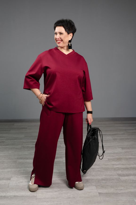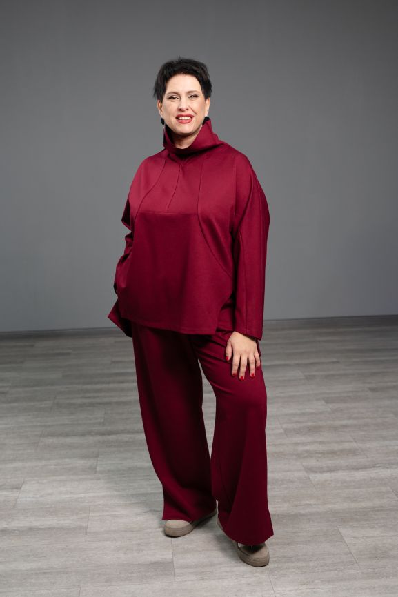 Модель брюк-труб подходит всем типам фигур. Визуально удлиняет ноги и делает их стройнее. Модель отлично скрывает объемы и особенности фигуры: за счет широкой штанины ноги кажутся стройнее, а благодаря высокой посадке и поясу на резинке зрительно корректируется объем живота. Пояс на резинке обеспечивает удобную посадку и позволяет ее регулировать в зависимости от объема талии. Благодаря резинке на талии брюки можно носить сразу при нескольких размерах - можно немного худеть или поправляться, а брюки будут оставаться актуальными.