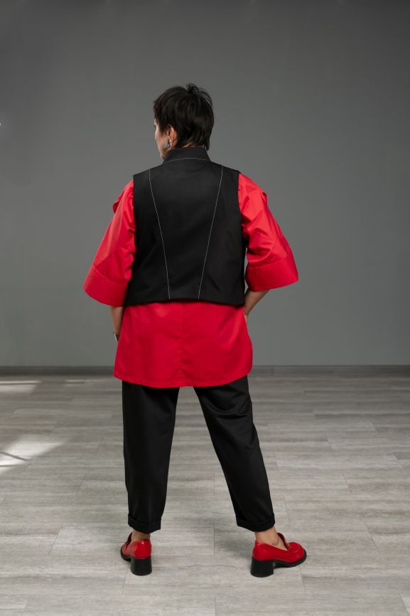 Благодаря вискозе в составе ткань свободно пропускает воздух и хорошо впитывает влагу, обеспечивая комфорт. Ткань мягкая при соприкосновении с телом. За счет полиэстера ткань хорошо держит форму, меньше мнется и не теряет цвет после стирки. Эластан, входящий в ткань, дает возможность изделию не растягиваться в районе коленей и принимать изначальную форму после стирки. Благодаря эластану изделия не сковывают движения и позволяют активно двигаться в течение дня.