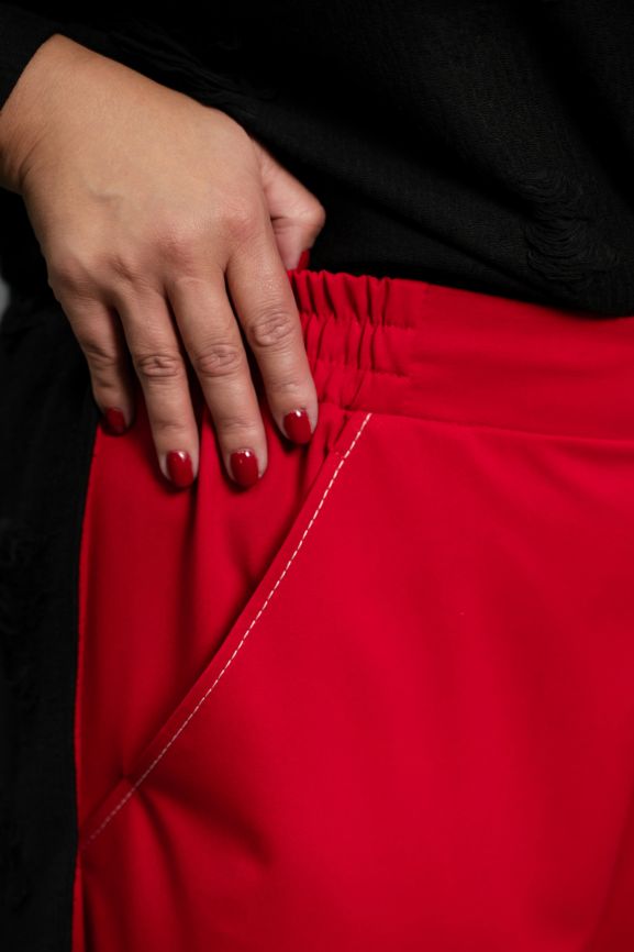 Благодаря вискозе в составе ткань свободно пропускает воздух и хорошо впитывает влагу, обеспечивая комфорт. Ткань мягкая при соприкосновении с телом. За счет полиэстера ткань хорошо держит форму, меньше мнется и не теряет цвет после стирки. Эластан, входящий в ткань, дает возможность изделию не растягиваться в районе коленей и принимать изначальную форму после стирки. Благодаря эластану изделия не сковывают движения и позволяют активно двигаться в течение дня.