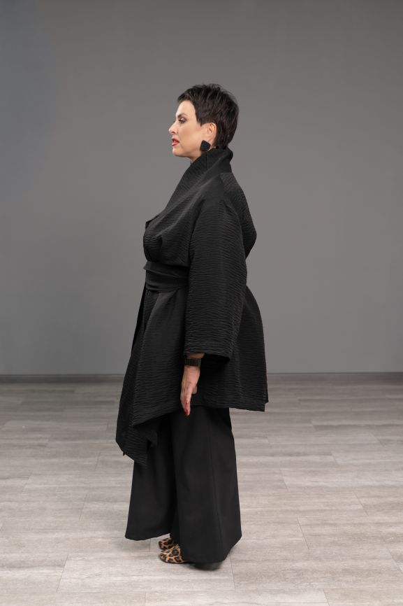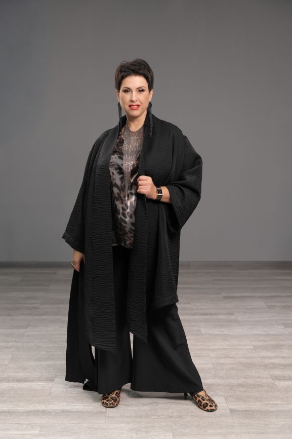 - Кимоно хорошо держит форму. Базовый фасон из ткани с анималистичным принтом