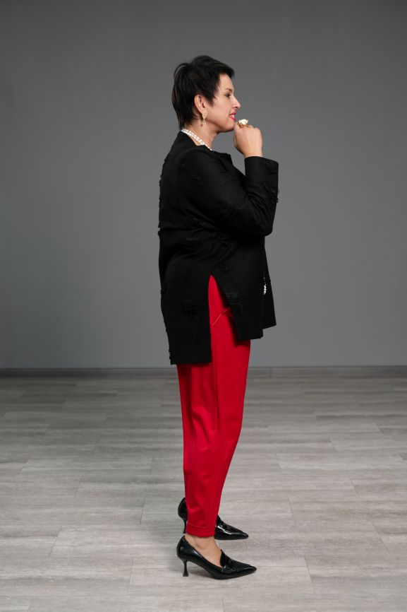 Благодаря вискозе в составе ткань свободно пропускает воздух и хорошо впитывает влагу, обеспечивая комфорт. Ткань мягкая при соприкосновении с телом. За счет полиэстера ткань хорошо держит форму, меньше мнется и не теряет цвет после стирки. Эластан, входящий в ткань, дает возможность изделию не растягиваться в районе коленей и принимать изначальную форму после стирки. Благодаря эластану изделия не сковывают движения и позволяют активно двигаться в течение дня.