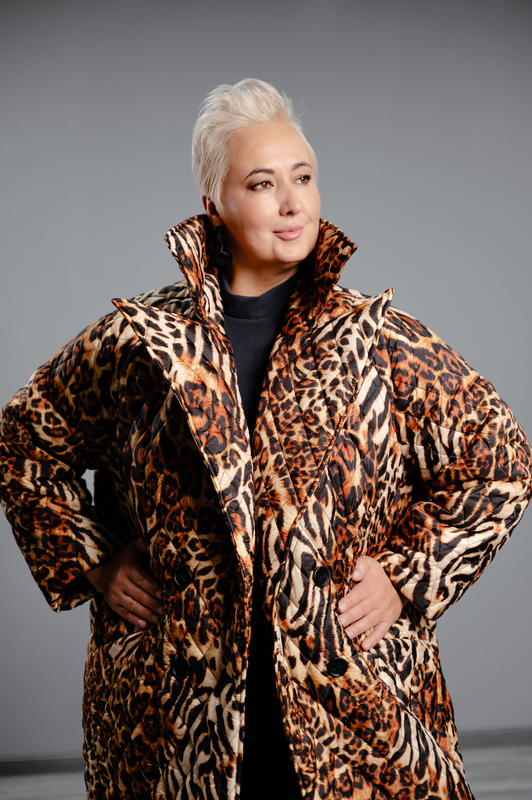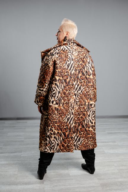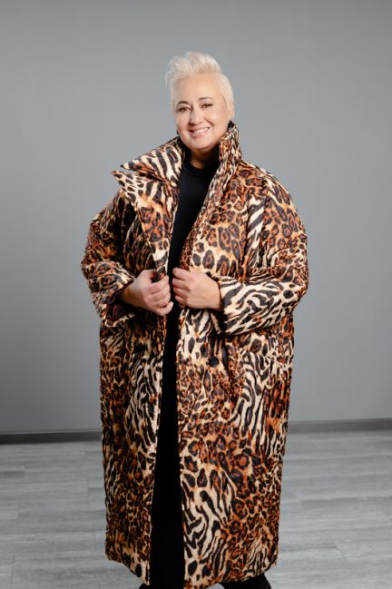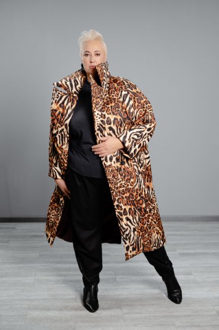 Параметры модели на фото: объем груди 125 см, объем талии 105 см, объем бедер 125 см, рост 172 см