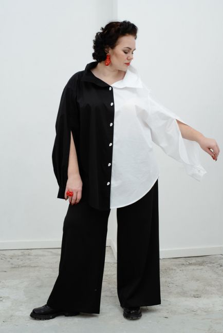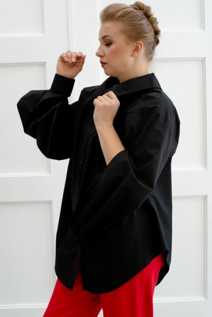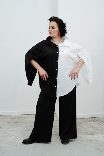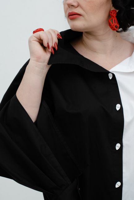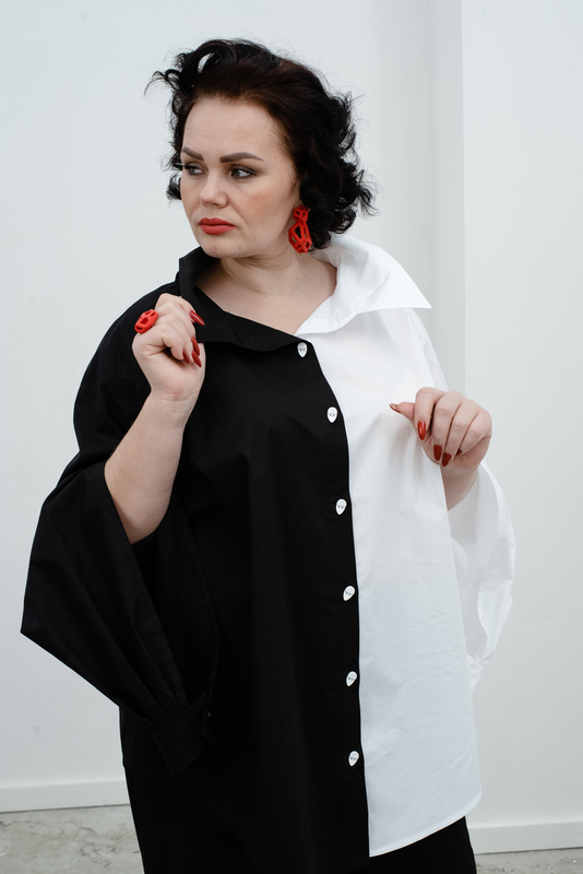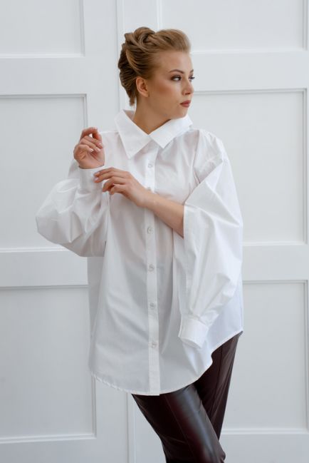 - Немного расклешенный силуэт рубашки изящно формирует талию и бедра