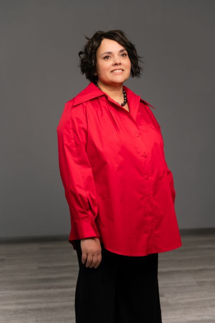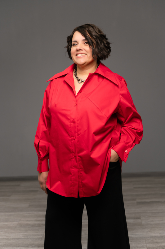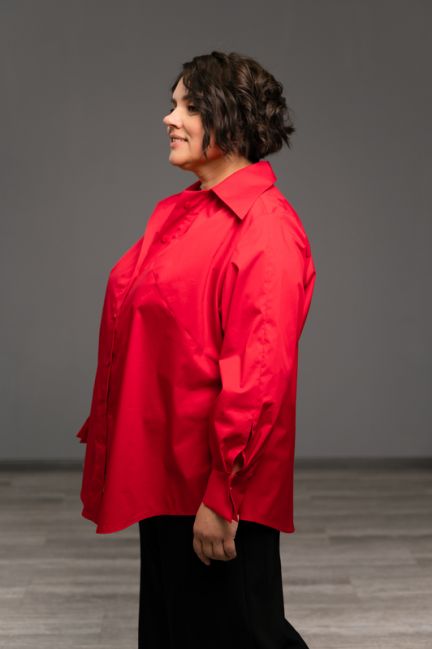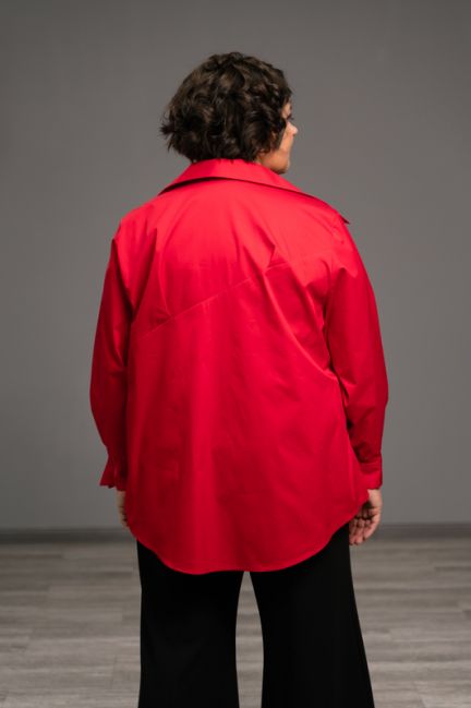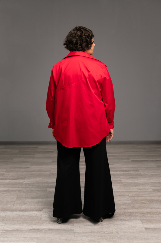 Рубашка с асимметричной кокеткой. Отложной воротник с разлетом красиво формирует плечевую линию, зрительно расширяет плечи, что делает тоньше шею и талию. Можно носить в застегнутом виде как классическую рубашку, если расстегнуть пару верхних пуговиц ворот будет смотреться как лацкан. Планка с пуговицами сужается книзу, создавая зрительную иллюзию - работает на сужение талии.