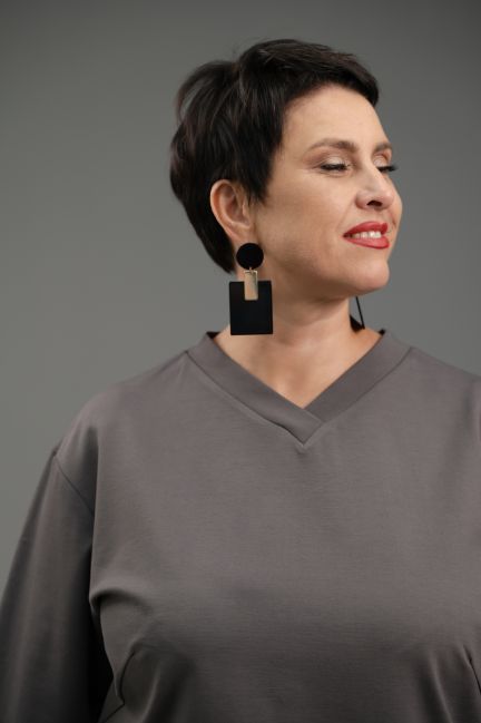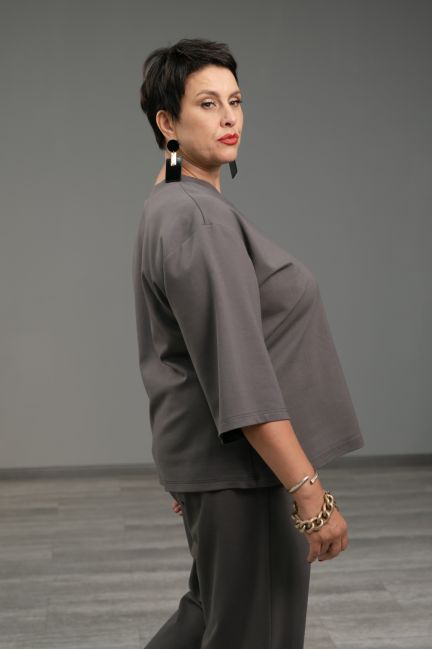 Свитшот имеет V-образный вырез, красиво обрамляющий шею. Свитшот свободный по крою - между телом и тканью прослойка воздуха. Свитшот возможно носить девушкам с разными объемами тела и ростом. Передние вытачки расположены так, что могут подойти для груди любого размера от небольшого до невероятно шикарного) Подрезанные линии, переходящие в удобные разрезы, обозначают линию талии на любой фигуре. Разрезы по бокам позволяют удобно садиться свитшоту на широкие бедра.
