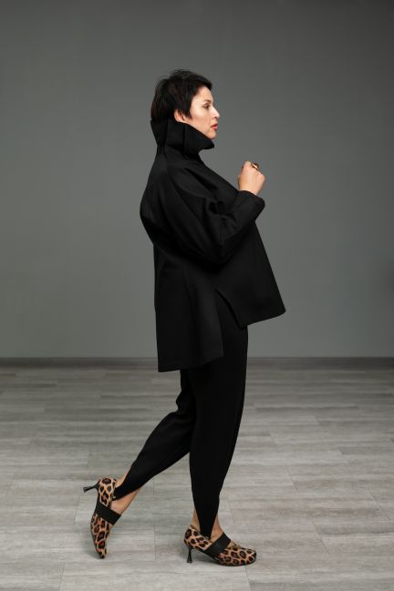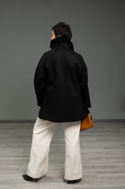 - Воротник позволяет моделировать любые варианты носки: при поднятом воротнике мы получаем строгие линии воротника стойки. Можно отогнуть только спереди и получится более свободный вариант. Или вариант - полностью отогнутый воротник - и вот уже шея красиво обнажена